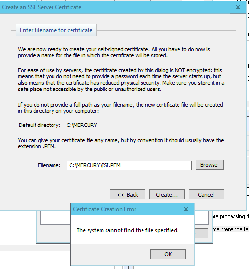 Hi. New standalone server on my PC. Some parts working. But right now my question is about creating the SSL certificate. I followed the manual. Popup window is 'Certificate Creation Error' stating 'The system cannot find the file specified'. I even tried a fakeout by creating a file with the same name i.e.'a.pem'. Help.