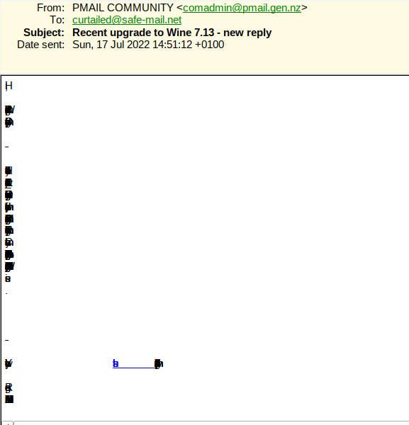 Knowing that I'd get short shrift on a Wine forum unless I was using entirely the latest of everything, I "upgraded" to Pegasus Mail 4.80. All within the new Wine. And now it won't start at all!