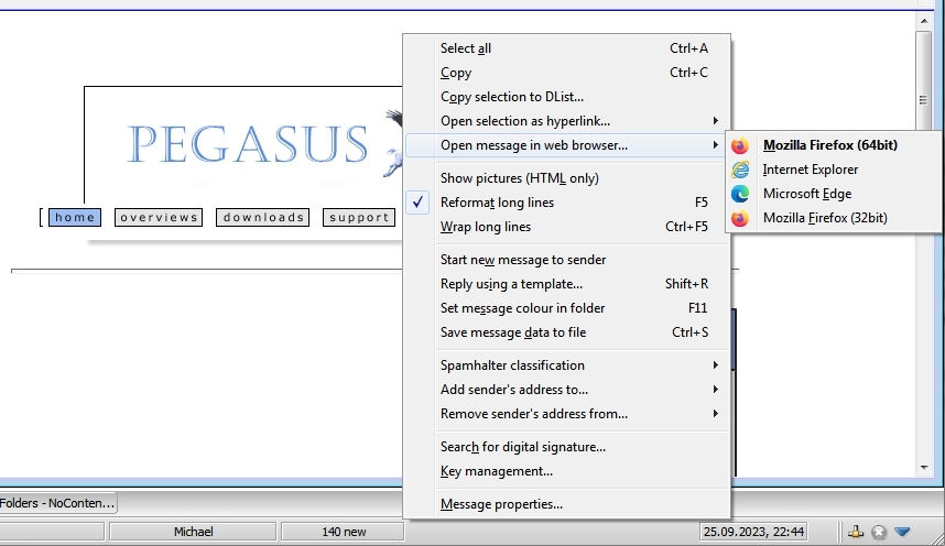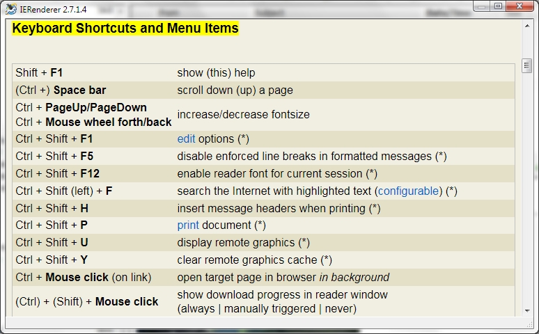Since the Auto-Update functionality is broken in IER 2.7.1.2 I'm posting this announcement here for once: - The usual after-release fixes: Copying incomplete sections of HTML formatted message parts to clipboard would result in HTML code pasted instead of formatted contents if not pasting them as plain text. This has been fixed now. - And the update check was broken due to some changes applied to remote file download checks for avoiding privacy issues connected to font downloads from third party providers behind the scenes. Fixed as well. - Additionally I've applied some enhancements to the online help for not missing the embedded images when launched outside of Pegasus Mail immediately after install. For IER's history page providing the download link please see my sigature below.
