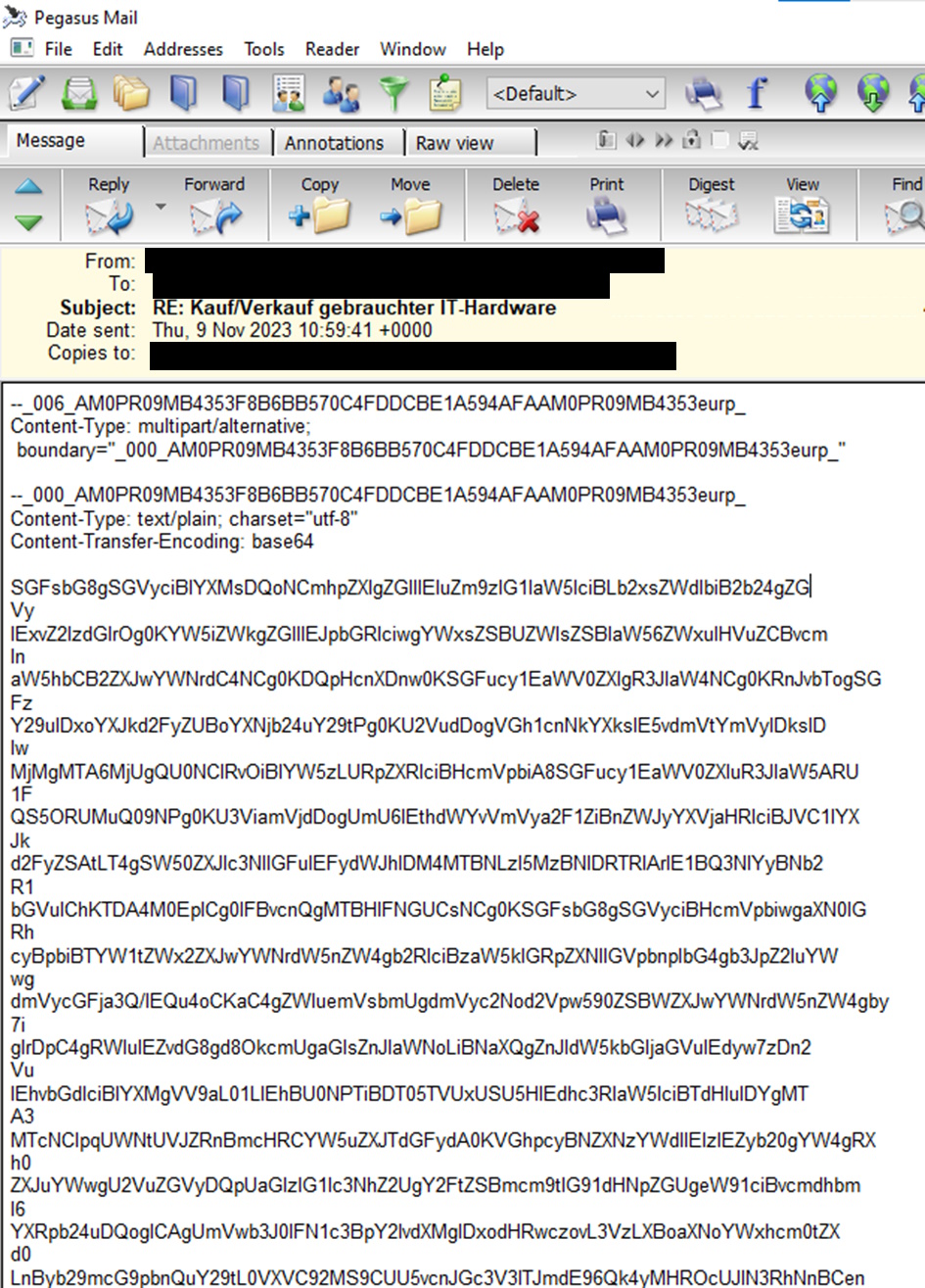 Thanks for submitting the sample message, and I can say there's nothing wrong with it: If putting it into Pegasus Mail's new mail folder it shows the same result as you submitted in your first post, and when opening the message properties (by either right clicking the message in its folder or highlighting it there and pressing F12) I can see that Pegasus Mail for whatever reason didn't properly detect the MIME structure of the message since none of the flags refering to this were enabled, only the Has been read status. After removing the X-PMFLAGS: ... line from the message's raw data and having Pegasus Mail rescan the new mail folder (i.e. close & reopen) it now shows the proper flags on my system which makes Pegasus Mail and IER properly display the message as to be expected, here's what the properties screen shoud look like for this message (anonymized):