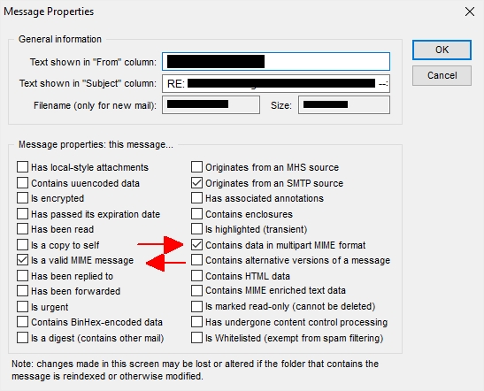 Now there's the question: Why did Pegasus Mail fail to write the proper flags to the message file when scanned on your system? Actually I can only make a guess which might have something to do with an improper termination of the primary message scan, and a likely candidate would be the outdated version of IER you're using, so that's the first thing I would recommend to do: Go to IER's history page as shown down below in my signature and get the most recent version of IER to figure out whether this issue stil occurs after doing so. This won't fix the currently affected messages, though, and setting the proper flags manually isn't as easy as it might look since the affected messages might not have the same internal structure, so simply switching flags on the properties page isn't exactly safe if not being familiar with the MIME rules.