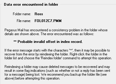 While being there also copy the "WINPMAIL.EXE directory" and paste its path into a Windows File Explorer address line to open the respective directory where you'll find a file named "mbxmaint_ui.exe": Double clicking it will offer you various ways for dealing with folder issues including reindexing, all to be done while Pegasus Mail is closed, of course.