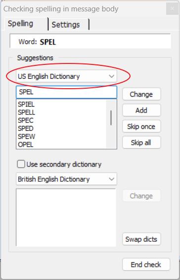 Verify that your spell checker is configured to use the appropriate dictionary (see image below). Also, you said that you are using the latest version of Pegasus Mail which is 4.80 however that version has a bug that breaks the saving of user defined words in the spell checker. The 4.81 public beta fixes that problem. Its only known issue of significance affects users whose Home and New mailbox directories are different, which is uncommon. ![673d12cf1a049](serve/attachment&path=673d12cf1a049)