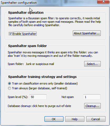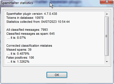 My Spamhalter use is similar to Euler's except I have Spam level % at 80 and Not-spam at 2. I train by drag-n-drop from or to the NMF and Junk folder. Training using the traffic signal icon did not appear to work. These are my statistics: