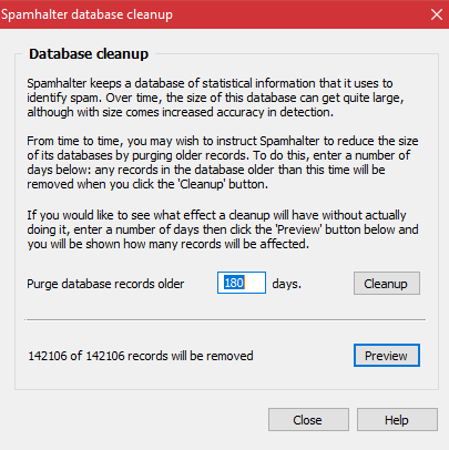 128,532 Spamhalter records seems high to me. I have 33508, 17745 of which would be removed if I did a database purge of older than 180. I think you might benefit from a complete purge and then start training from scratch, especially if you haven't been training it all along.