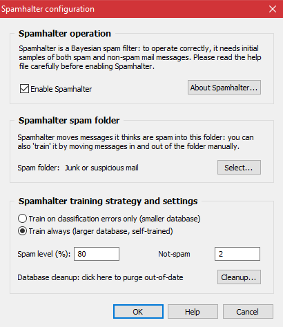 I'll chime in here with some comments but am not going to try to quote original references. 128,532 Spamhalter records seems high to me. I have 33508, 17745 of which would be removed if I did a database purge of older than 180. I think you might benefit from a complete purge and then start training from scratch, especially if you haven't been training it all along. My Spamhalter use is similar to Euler's except I have Spam level % at 80 and Not-spam at 2. I train by drag-n-drop from or to the NMF and Junk folder. Training using the traffic signal icon did not appear to work. These are my statistics: _SpamHalter plugin version: 4.7.0.438 Tokens in database: 33508 Statistics collected from: 1/14/2019 7:20:04 PM_ _All classified messages: 35286 Classified messages as spam: 8443 ... it is: 23.93%_ _Corrected classification mistakes Missed spams: 1621 ... it is: 4.5939% False positives: 577 ... it is: 1.6352%_ Euler's comment about the Spamhalter destination folder getting corrupted is spot on. It isn't common, but it does happen. My folder-close filter helps in advising me when there is a problem. I tried POP3 filtering but I couldn't stick with it. I didn't trust it. There was no way to check for unintended deletions. Local deletes where I can review the Deleted messages folder is my preference. Also, it felt like it slowed POP3 retrieval more than it could ever have offset filtering time.