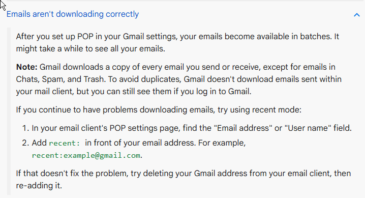 Gmail handles this differently than other servers. For example, a message read through the web interface on Yahoo won't be available for download via POP3 (already read). Gmail, however, is different, and messages read via the web will continue to be available for download via POP3, and in this case, they can be archived, deleted, or ignored. This leads me to wonder if the recent: option is being used. Is it? Below is a screenshot from the Gmail help page https://support.google.com/mail/answer/7104828?hl=en#zippy=%2Cemails-arent-downloading-correctly