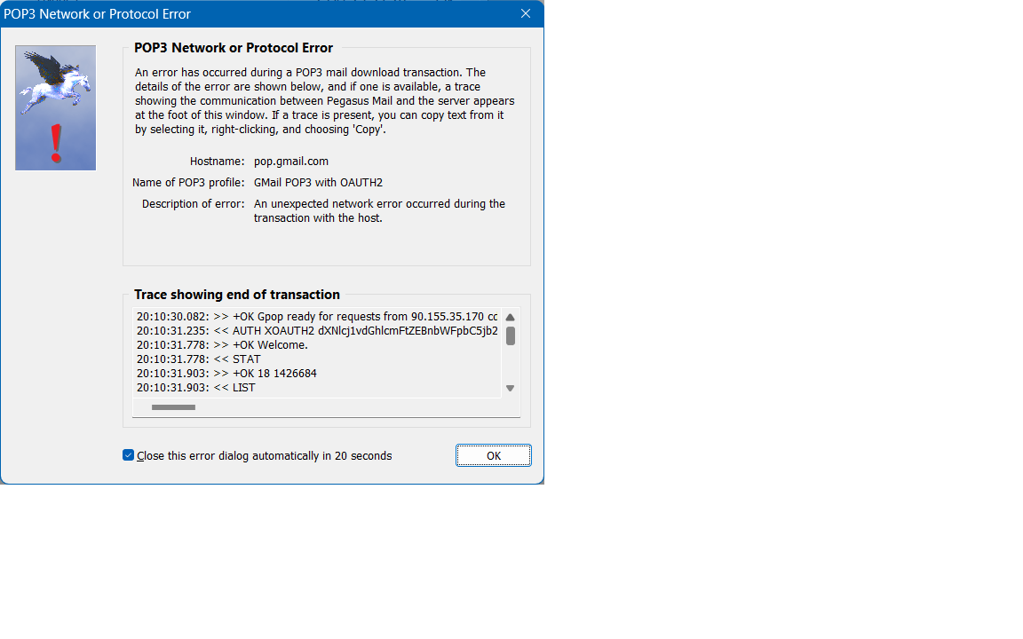 About 3 weeks ago I downloaded Pegasus Mail v4.91.1746 and updated my previous installation of v4.81-pb3 that I&#039;d been running successfully and accessing my various GMail mailboxes using OAUTH2 without any significant issues since v4.81-pb3 was first released in approx Feb 2023. Although I can&#039;t be absolutely certain about the timing, it seems to me that since I installed v4.91 I&#039;ve regularly been getting POP3 errors when accessing my various GMail mailboxes; the following is the error message that typically appears: 15:00:38.088: --- 3 Oct 2025, 15:00:38.088 --- 15:00:38.088: Connect to &#039;pop.gmail.com&#039;, timeout 300 seconds, flags 16842753. 15:00:39.102: [*] Setting SNI hostname to &#039;pop.gmail.com&#039; 15:00:39.117: [*] SSL/TLS session established 15:00:39.117: [*] TLS_AES_256_GCM_SHA384, TLSv1.3, Kx=any, Au=any, Enc=AESGCM(256), Mac=AEAD 15:00:39.117: [*] Peer&#039;s certificate name is &#039;/CN=pop.gmail.com&#039;. 15:00:39.133: &gt;&gt; +OK Gpop ready for requests from 90.155.35.170 e09e53db590de-858ac63b879mb108247354d85 15:00:39.133: &lt;&lt; AUTH XOAUTH2 dXNlcj1tYXJ0aW5nMGhkYkBnbWFpbC5jb20BYXV0aD1CZWFyZXIgeWEyOS5hMEFRUV9CRFNESnY3YnRZc3gyclFab3A2OXVpVGN2ZV9NX3B2SUpqWjhRcWJVNlBOOUNheDhlNXd3YmlFX281TWZFU0prWXBLZE5RVmVqVmJOU0NNbXZfZnk4cHpELTNUZUJwb29HZEQ2UnVHZUc2b1JHbzVZZkFWbzBHck5CWDhOV1NqUUZ3NEl0cUdndnlTRFVQWWFUYnR5cXlVUFROQmxfWV9XMUlEUXZMUDZaME4zTEFzQmNXRm1Mckp4MFlWUnh1VmtLOVhJckFhQ2dZS0FaQVNBUlVTRlFIR1gyTWlwOWdzY2lDMmNPWUllRUFaTG1GV1VnMDIwOQEB 15:00:39.972: &gt;&gt; +OK Welcome. 15:00:39.973: &lt;&lt; STAT 15:00:40.101: &gt;&gt; +OK 19 1639062 15:00:40.101: &lt;&lt; LIST 15:00:40.230: &gt;&gt; +OK 19 messages (1639062 bytes) 15:00:40.246: &lt;&lt; RETR 1 15:00:40.375: &gt;&gt; +OK message follows 15:00:40.401: &lt;&lt; DELE 1 15:00:40.520: &gt;&gt; +OK marked for deletion 15:00:40.520: &lt;&lt; RETR 2 15:00:40.659: &gt;&gt; +OK message follows The consequence of the POP3 errors is that the downloads of the 19 messages that are waiting on GMail never seem to complete successfully so the same messages appear again during the next download attempt. My GMail mailboxes are all configured to archive the messages on GMail after they&#039;ve been successfully downloaded by PMail; this always seemed to work perfectly well when I was running v4.81-pb3. Has anyone else encountered any issues of this sort when accessing GMail mailboxes using PMail v4.91? Thanks in advance, -- Martin Davies