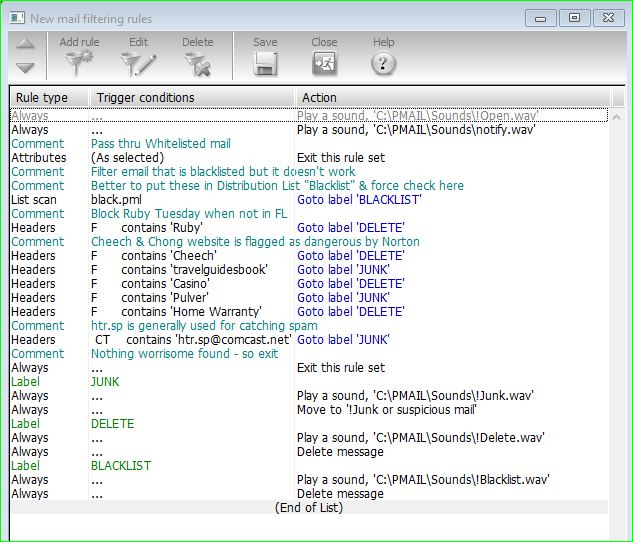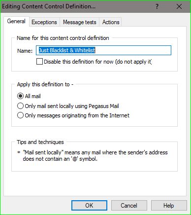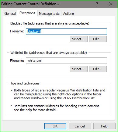 The blacklist I reference in my Content Control definition doesn't seem to work, but that may be because I have no content processing rules file defined. I'm trying to use just the Blacklist & Whitelist. List Scanning that Blacklist file in my new mail filter does work. When I edit the Whitelist file using the Content Control editor, there is nothing in the file, yet the Global Whitelist has hundreds of entries. I can't explain that, except that maybe the 2 Whitelists are separate.